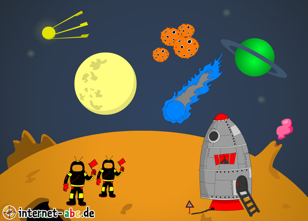 Mit der Rakete fliegen die 4 Internet-ABC-Tiere in den Weltraum. Was sie dort sehen und erleben, könnt ihr in diesem Baukasten malen und erzählen.