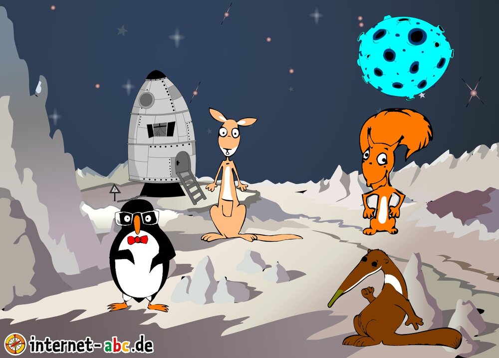 Mit der Rakete fliegen die 4 Internet-ABC-Tiere in den Weltraum. Was sie dort sehen und erleben, könnt ihr in diesem Baukasten malen und erzählen.