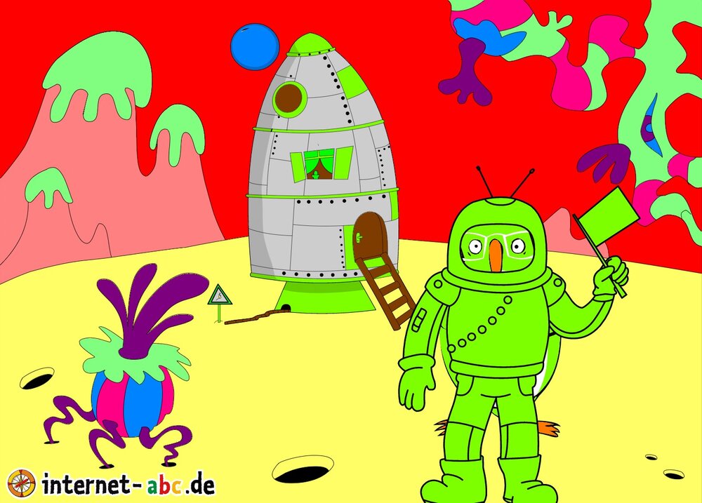 Mit der Rakete fliegen die 4 Internet-ABC-Tiere in den Weltraum. Was sie dort sehen und erleben, könnt ihr in diesem Baukasten malen und erzählen.