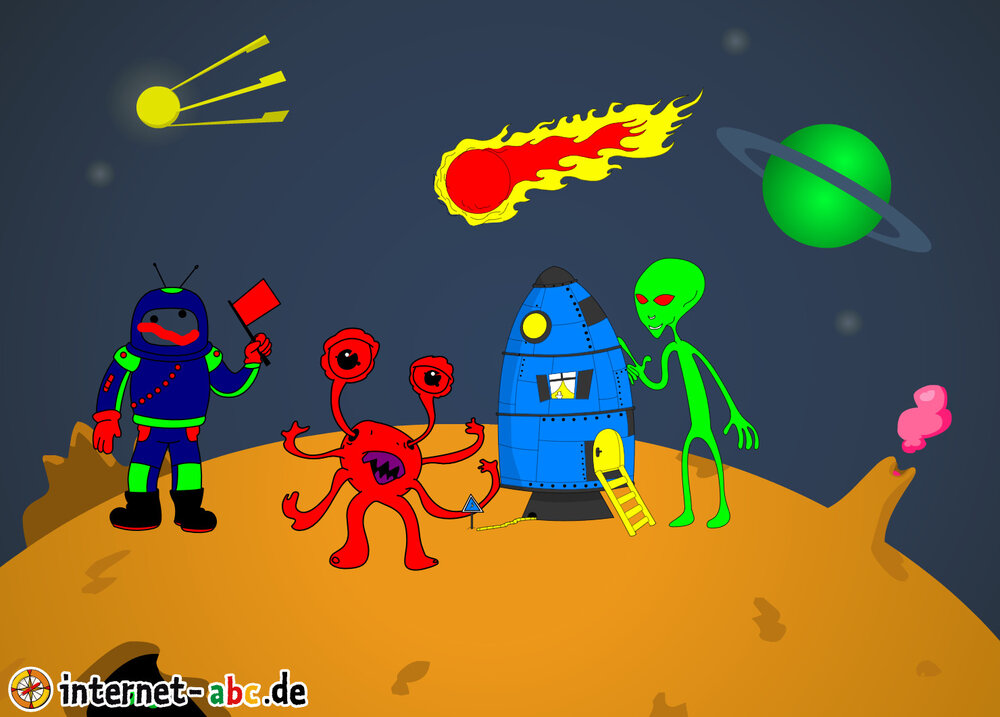 Mit der Rakete fliegen die 4 Internet-ABC-Tiere in den Weltraum. Was sie dort sehen und erleben, könnt ihr in diesem Baukasten malen und erzählen.
