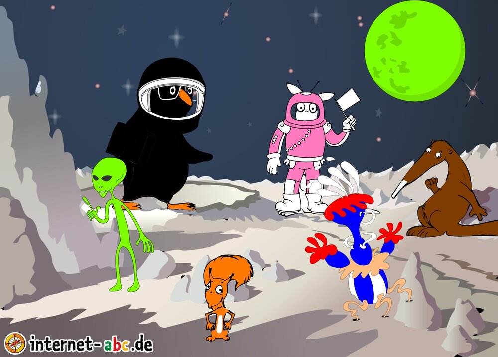 Mit der Rakete fliegen die 4 Internet-ABC-Tiere in den Weltraum. Was sie dort sehen und erleben, könnt ihr in diesem Baukasten malen und erzählen.