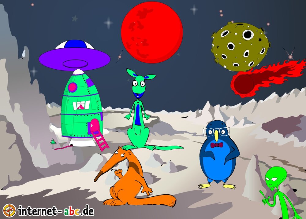 Mit der Rakete fliegen die 4 Internet-ABC-Tiere in den Weltraum. Was sie dort sehen und erleben, könnt ihr in diesem Baukasten malen und erzählen.