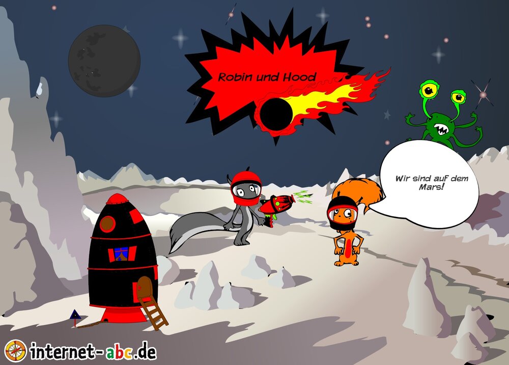 Mit der Rakete fliegen die 4 Internet-ABC-Tiere in den Weltraum. Was sie dort sehen und erleben, könnt ihr in diesem Baukasten malen und erzählen.