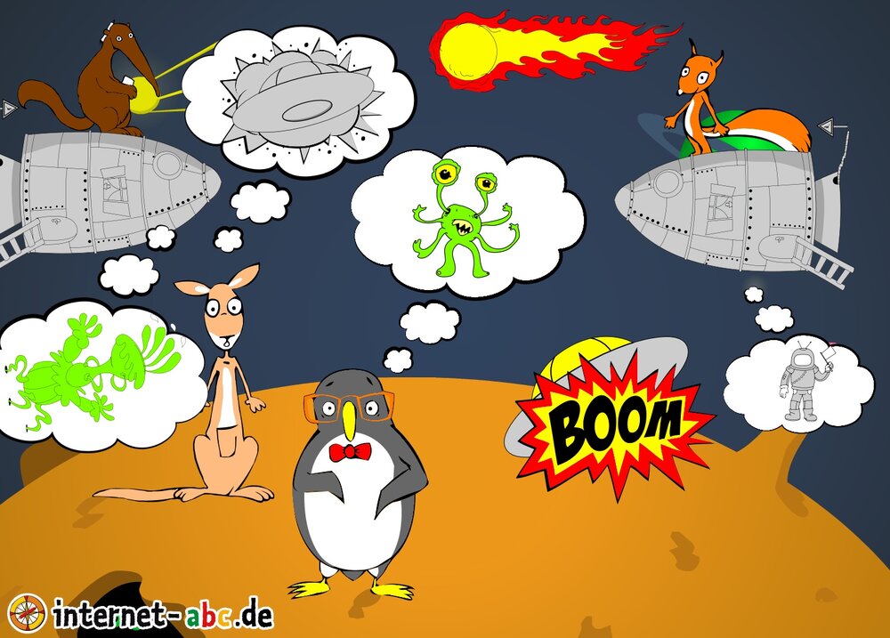 Mit der Rakete fliegen die 4 Internet-ABC-Tiere in den Weltraum. Was sie dort sehen und erleben, könnt ihr in diesem Baukasten malen und erzählen.
