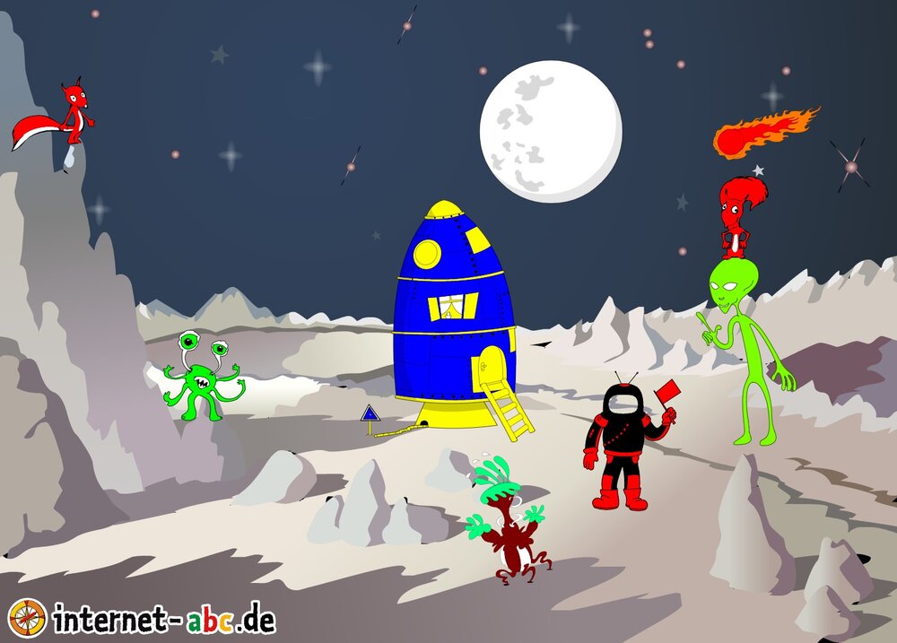 Mit der Rakete fliegen die 4 Internet-ABC-Tiere in den Weltraum. Was sie dort sehen und erleben, könnt ihr in diesem Baukasten malen und erzählen.