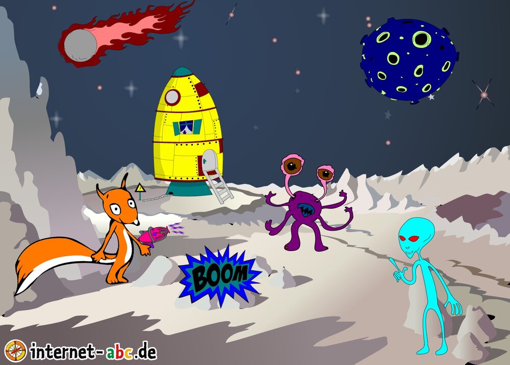 Mit der Rakete fliegen die 4 Internet-ABC-Tiere in den Weltraum. Was sie dort sehen und erleben, könnt ihr in diesem Baukasten malen und erzählen.