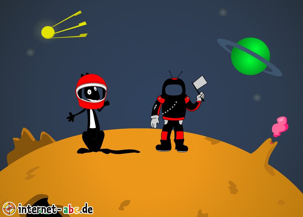 Mit der Rakete fliegen die 4 Internet-ABC-Tiere in den Weltraum. Was sie dort sehen und erleben, könnt ihr in diesem Baukasten malen und erzählen.