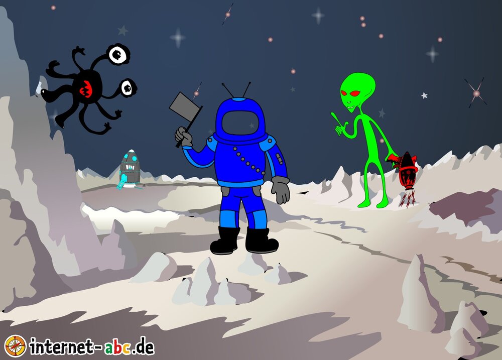 Mit der Rakete fliegen die 4 Internet-ABC-Tiere in den Weltraum. Was sie dort sehen und erleben, könnt ihr in diesem Baukasten malen und erzählen.