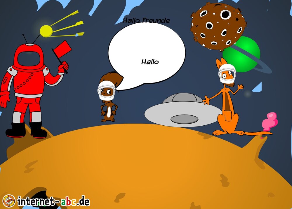 Mit der Rakete fliegen die 4 Internet-ABC-Tiere in den Weltraum. Was sie dort sehen und erleben, könnt ihr in diesem Baukasten malen und erzählen.