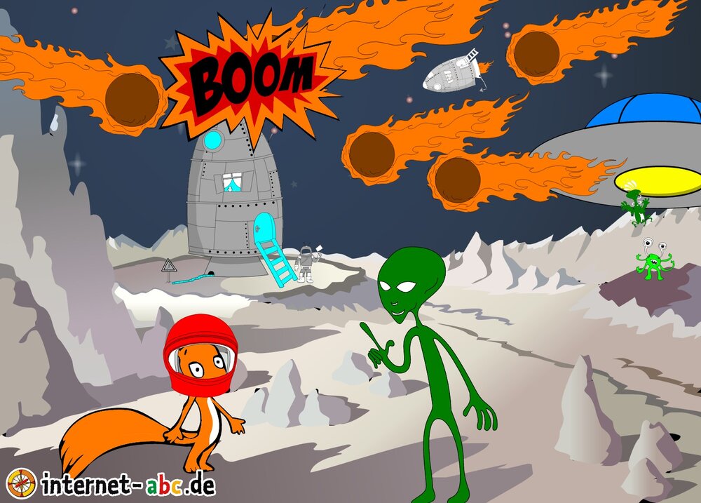 Mit der Rakete fliegen die 4 Internet-ABC-Tiere in den Weltraum. Was sie dort sehen und erleben, könnt ihr in diesem Baukasten malen und erzählen.
