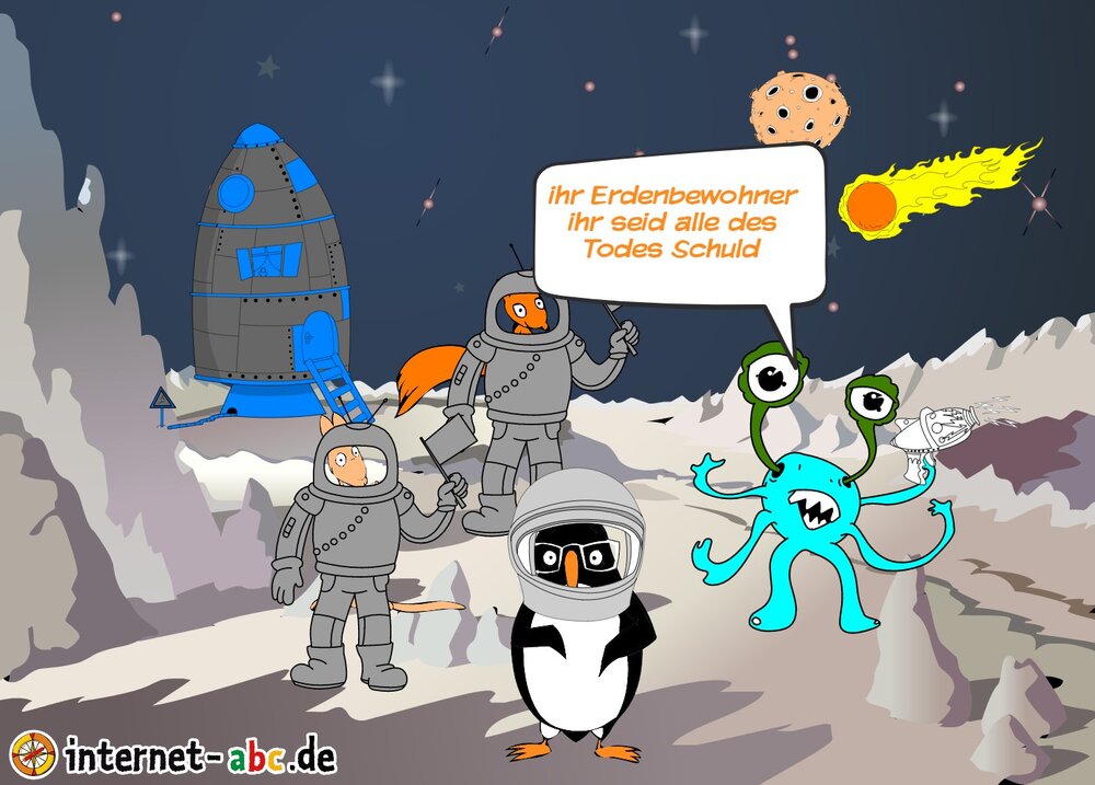 Mit der Rakete fliegen die 4 Internet-ABC-Tiere in den Weltraum. Was sie dort sehen und erleben, könnt ihr in diesem Baukasten malen und erzählen.