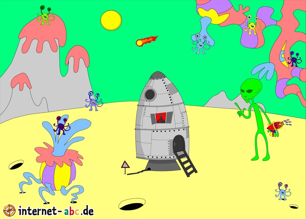 Mit der Rakete fliegen die 4 Internet-ABC-Tiere in den Weltraum. Was sie dort sehen und erleben, könnt ihr in diesem Baukasten malen und erzählen.
