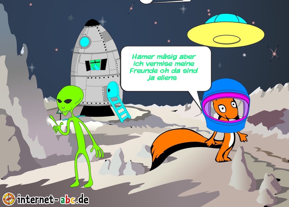 Mit der Rakete fliegen die 4 Internet-ABC-Tiere in den Weltraum. Was sie dort sehen und erleben, könnt ihr in diesem Baukasten malen und erzählen.