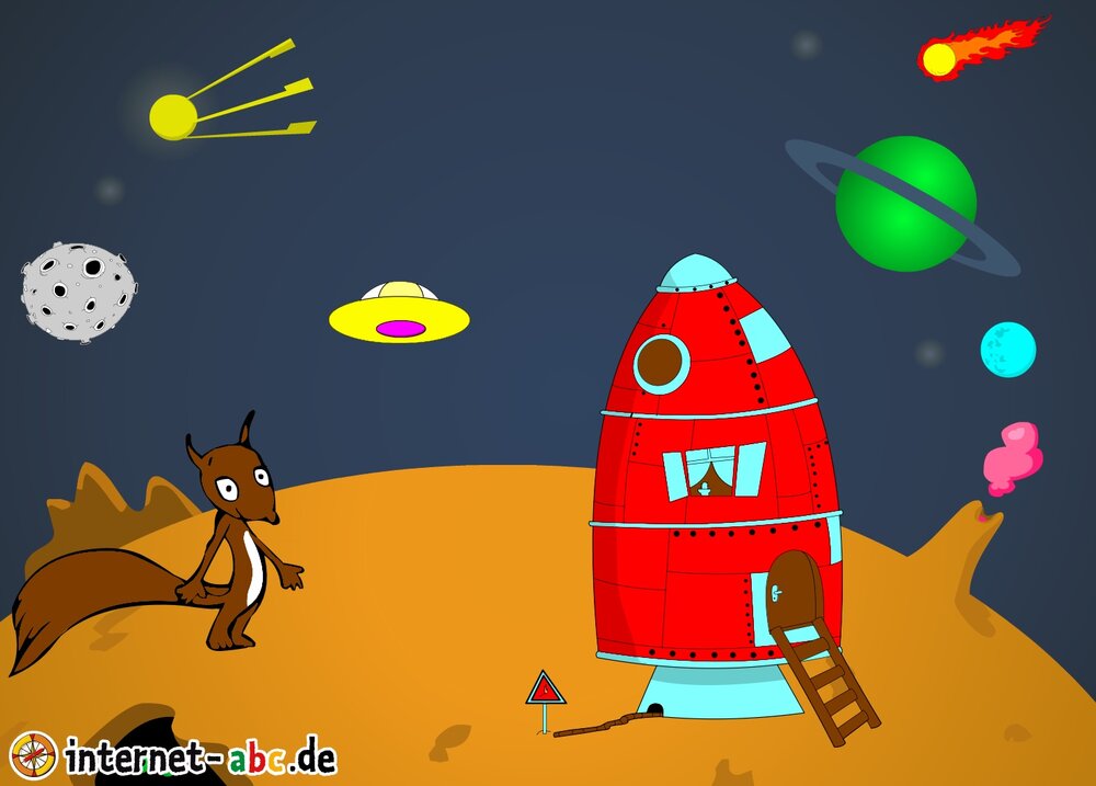 Mit der Rakete fliegen die 4 Internet-ABC-Tiere in den Weltraum. Was sie dort sehen und erleben, könnt ihr in diesem Baukasten malen und erzählen.