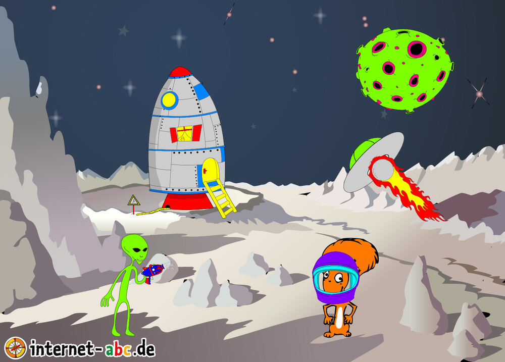 Mit der Rakete fliegen die 4 Internet-ABC-Tiere in den Weltraum. Was sie dort sehen und erleben, könnt ihr in diesem Baukasten malen und erzählen.