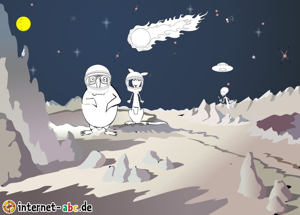 Mit der Rakete fliegen die 4 Internet-ABC-Tiere in den Weltraum. Was sie dort sehen und erleben, könnt ihr in diesem Baukasten malen und erzählen.