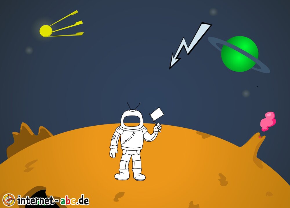 Mit der Rakete fliegen die 4 Internet-ABC-Tiere in den Weltraum. Was sie dort sehen und erleben, könnt ihr in diesem Baukasten malen und erzählen.