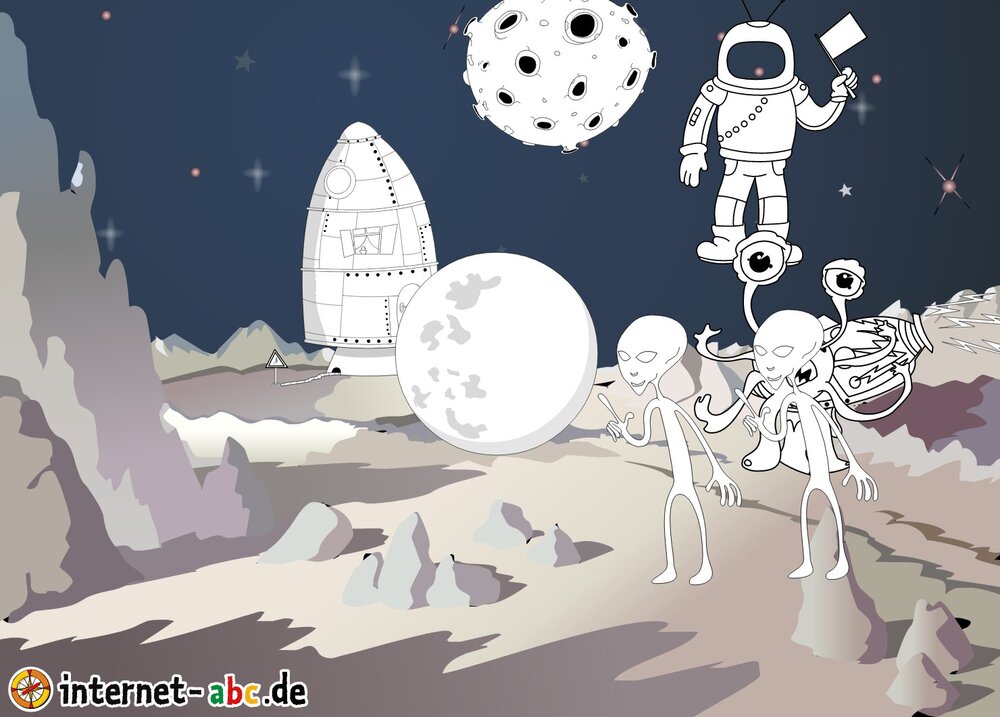 Mit der Rakete fliegen die 4 Internet-ABC-Tiere in den Weltraum. Was sie dort sehen und erleben, könnt ihr in diesem Baukasten malen und erzählen.