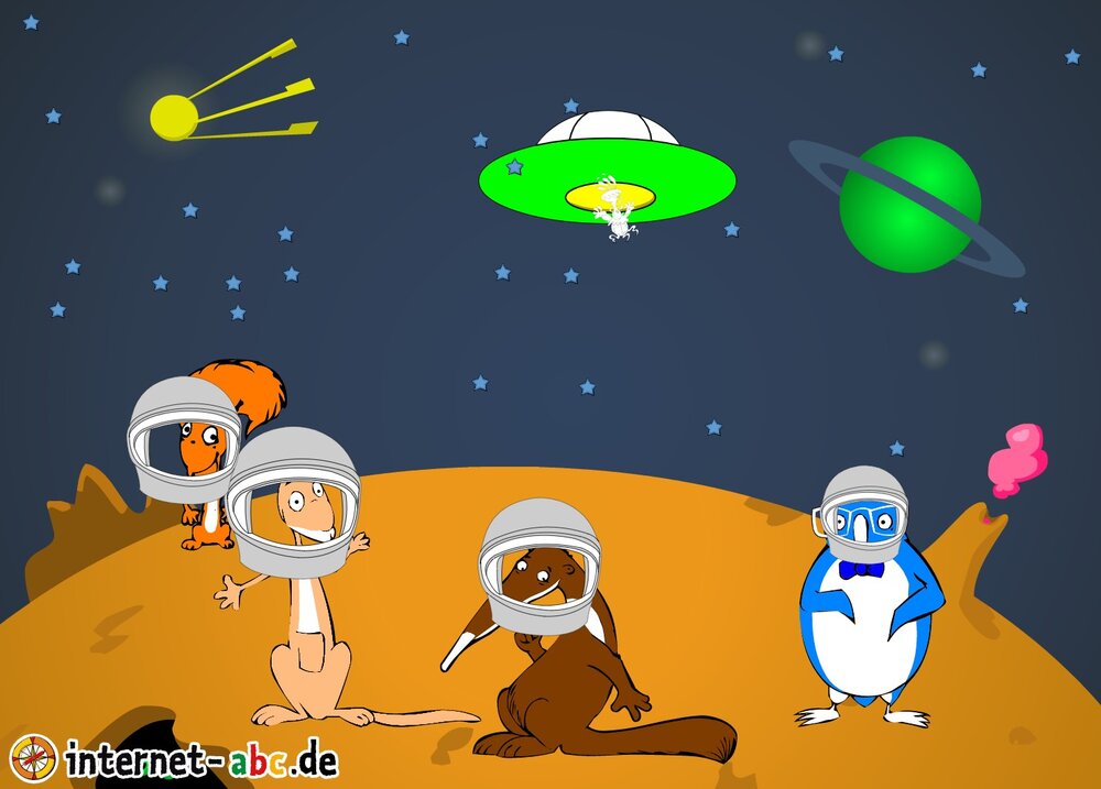 Mit der Rakete fliegen die 4 Internet-ABC-Tiere in den Weltraum. Was sie dort sehen und erleben, könnt ihr in diesem Baukasten malen und erzählen.