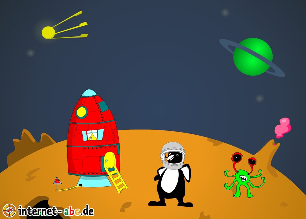 Mit der Rakete fliegen die 4 Internet-ABC-Tiere in den Weltraum. Was sie dort sehen und erleben, könnt ihr in diesem Baukasten malen und erzählen.