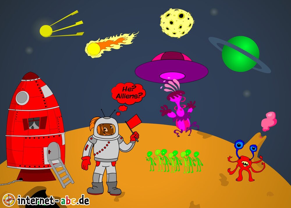 Mit der Rakete fliegen die 4 Internet-ABC-Tiere in den Weltraum. Was sie dort sehen und erleben, könnt ihr in diesem Baukasten malen und erzählen.