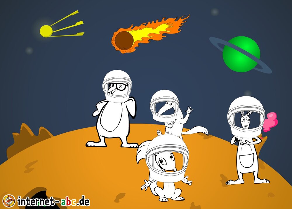 Mit der Rakete fliegen die 4 Internet-ABC-Tiere in den Weltraum. Was sie dort sehen und erleben, könnt ihr in diesem Baukasten malen und erzählen.