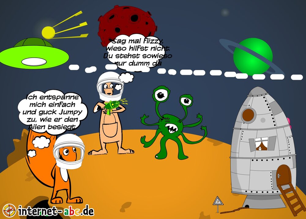 Jumpy und Flizzy sind mit der Rakete ins Weltall gereist. Jumpy muss ein Ailen besiegen, während Flizzy da dumm steht