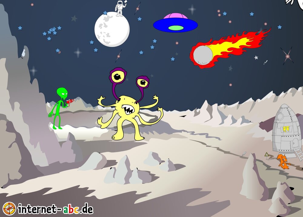 Mit der Rakete fliegen die 4 Internet-ABC-Tiere in den Weltraum. Was sie dort sehen und erleben, könnt ihr in diesem Baukasten malen und erzählen.