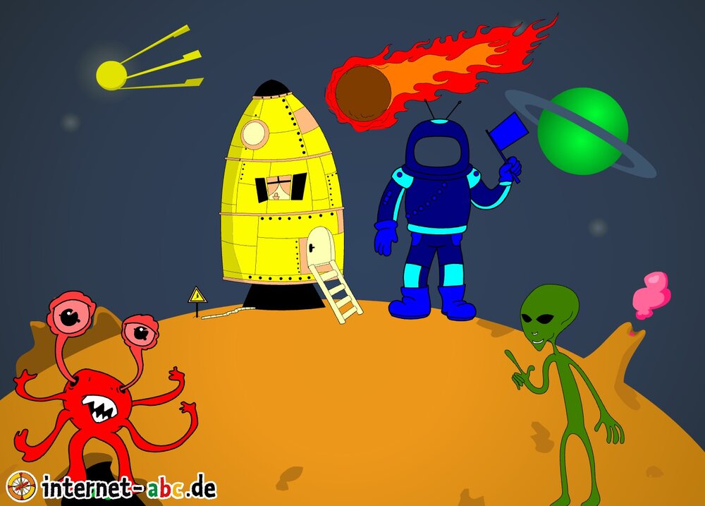 Mit der Rakete fliegen die 4 Internet-ABC-Tiere in den Weltraum. Was sie dort sehen und erleben, könnt ihr in diesem Baukasten malen und erzählen.
