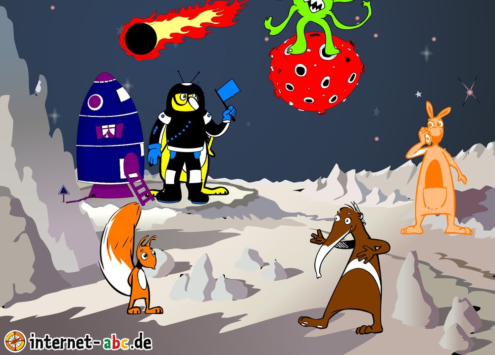 Die Internet - ABC Tiere sind auf dem Mond.Eddie im Raumanzug hisst die blaue Flagge für den blauen Planeten ( unsere Erde 🌎).