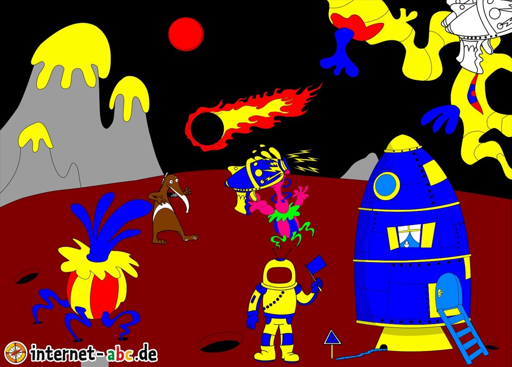 Mit der Rakete fliegen die 4 Internet-ABC-Tiere in den Weltraum. Was sie dort sehen und erleben, könnt ihr in diesem Baukasten malen und erzählen.