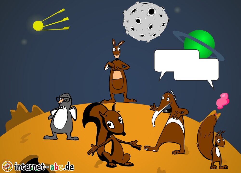 Mit der Rakete fliegen die 4 Internet-ABC-Tiere in den Weltraum. Was sie dort sehen und erleben, könnt ihr in diesem Baukasten malen und erzählen.
