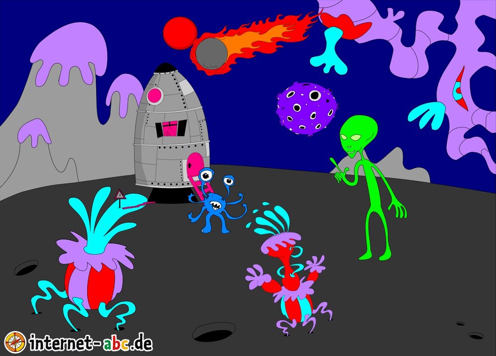 Mit der Rakete fliegen die 4 Internet-ABC-Tiere in den Weltraum. Was sie dort sehen und erleben, könnt ihr in diesem Baukasten malen und erzählen.