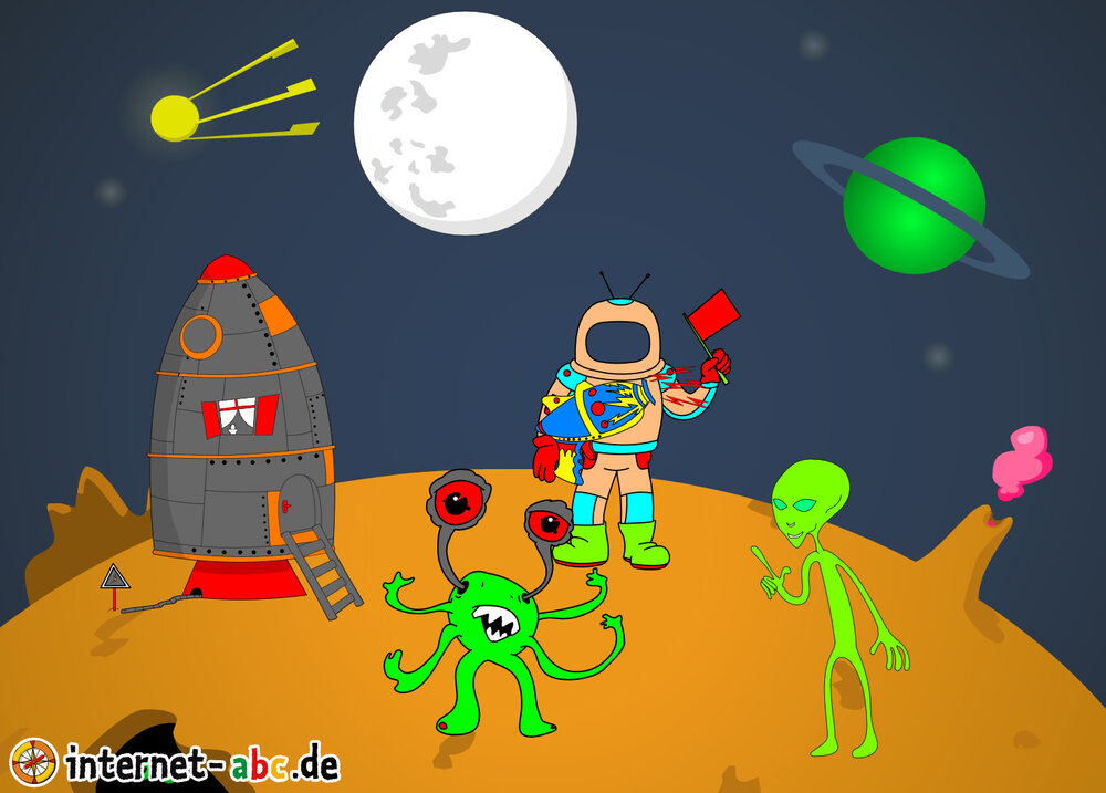 Mit der Rakete fliegen die 4 Internet-ABC-Tiere in den Weltraum. Was sie dort sehen und erleben, könnt ihr in diesem Baukasten malen und erzählen.