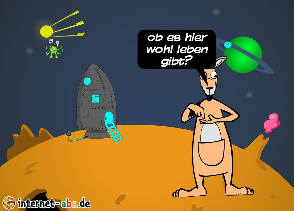 Mit der Rakete fliegen die 4 Internet-ABC-Tiere in den Weltraum. Was sie dort sehen und erleben, könnt ihr in diesem Baukasten malen und erzählen.