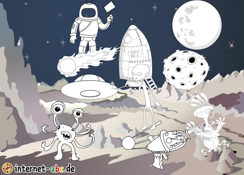 Mit der Rakete fliegen die 4 Internet-ABC-Tiere in den Weltraum. Was sie dort sehen und erleben, könnt ihr in diesem Baukasten malen und erzählen.