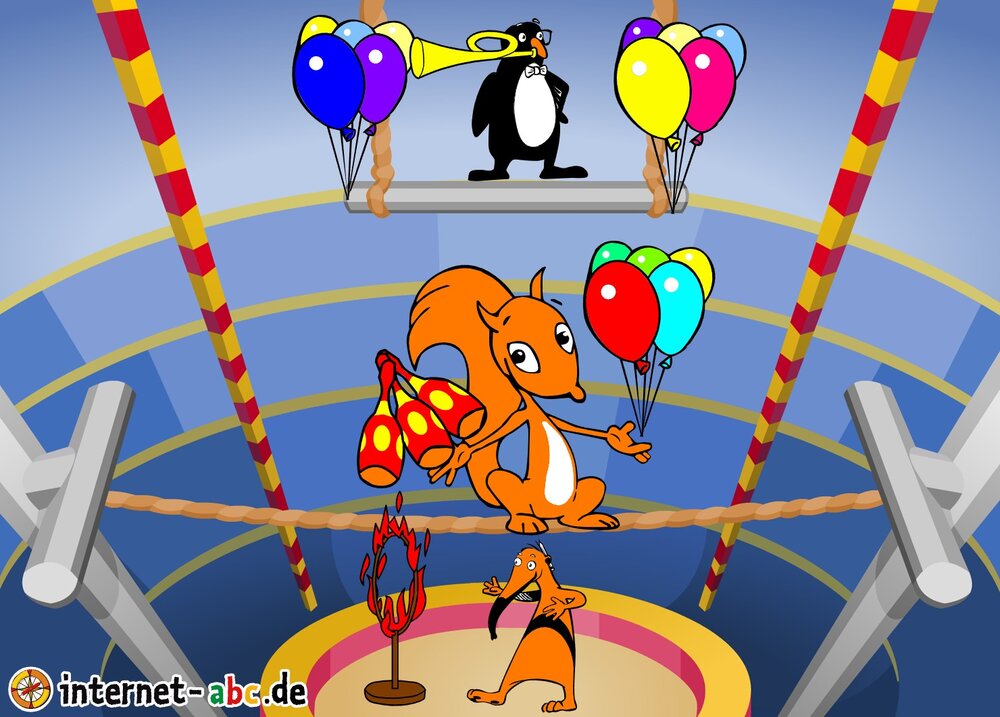 Gehst du gern in den Zirkus? Dann male doch ein schönes Bild mit den Internet-ABC-Tieren. Und erzähle dann eine kleine Geschichte dazu, okay?