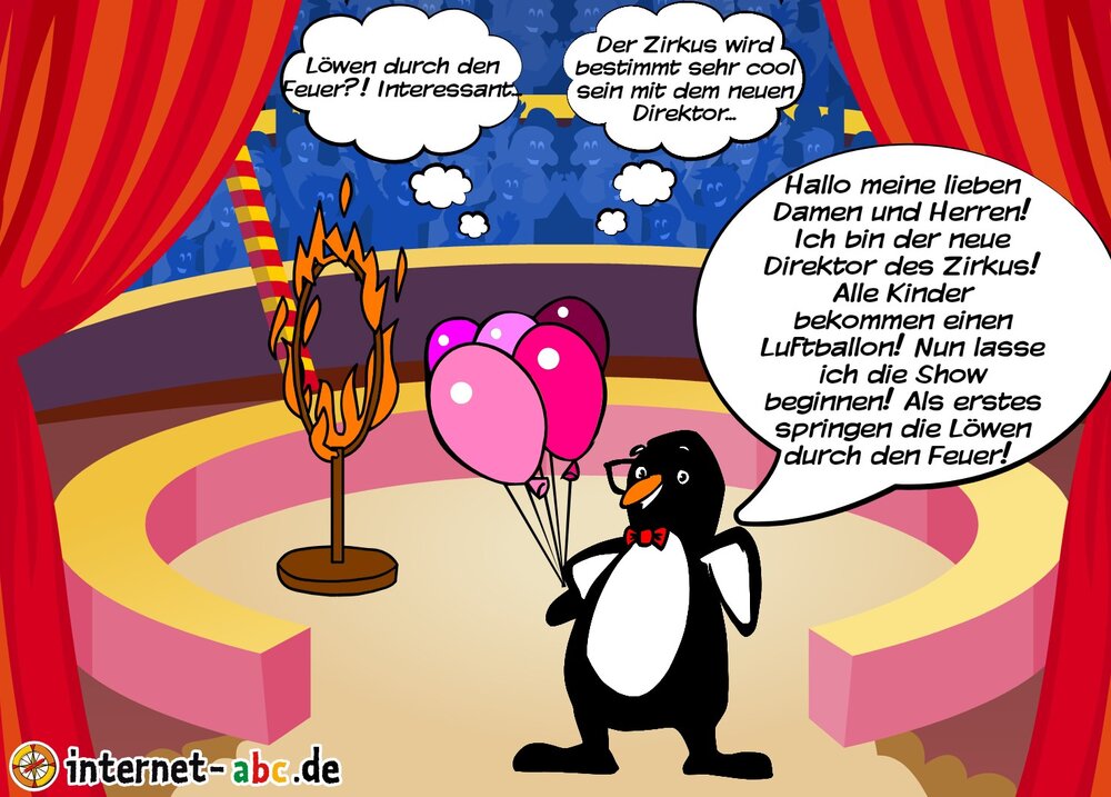 Der Pinguin hat im Glücksrad ein Zirkus gewonnen. "Ich bin der neue Direktor und Besitzer des Zirkus!", rief der Pinguin froh. Am nächsten Tag ging er zum Zirkus, um sich sein neuen Besitz genauer anzuschauen. In 1 Woche und 2 Tagen fing der Zirkus schon an. Der Direktor Pinguin begrüßte alle herzlich. Dann begann die Zirkus-Show...Nach der Show sagten ihm alle Komplimente: "Sooo toller Zirkus, sooo tolle Show!" Immermehr Leute gingen zu seinem Zirkus. In 1 Jahr wurde er sehr reich. Er kaufte noch 4 Zirkuse und lebte sehr glücklich...