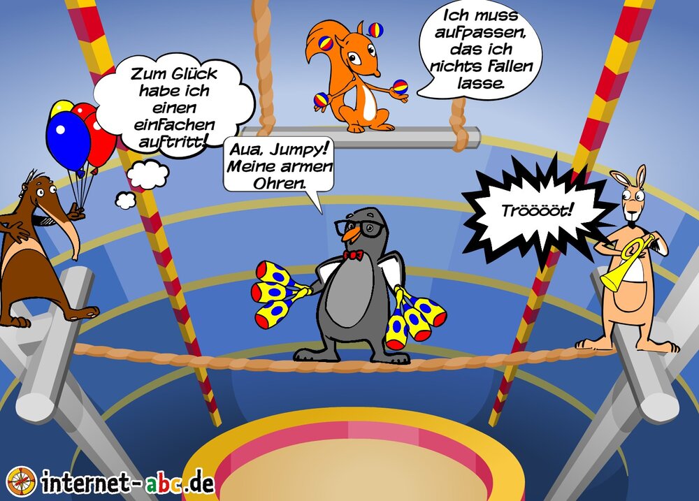 Gehst du gern in den Zirkus? Dann male doch ein schönes Bild mit den Internet-ABC-Tieren. Und erzähle dann eine kleine Geschichte dazu, okay?