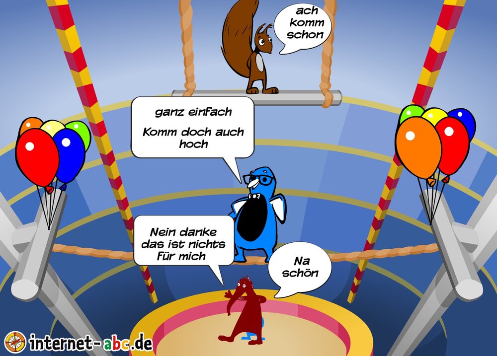 Gehst du gern in den Zirkus? Dann male doch ein schönes Bild mit den Internet-ABC-Tieren. Und erzähle dann eine kleine Geschichte dazu, okay?