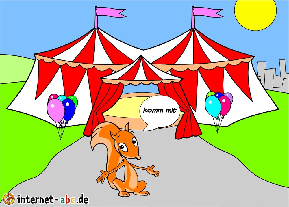 Gehst du gern in den Zirkus? Dann male doch ein schönes Bild mit den Internet-ABC-Tieren. Und erzähle dann eine kleine Geschichte dazu, okay?