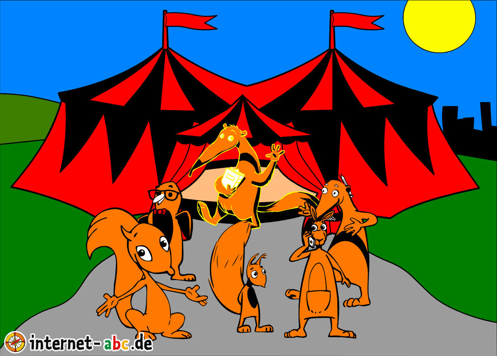Gehst du gern in den Zirkus? Dann male doch ein schönes Bild mit den Internet-ABC-Tieren. Und erzähle dann eine kleine Geschichte dazu, okay?