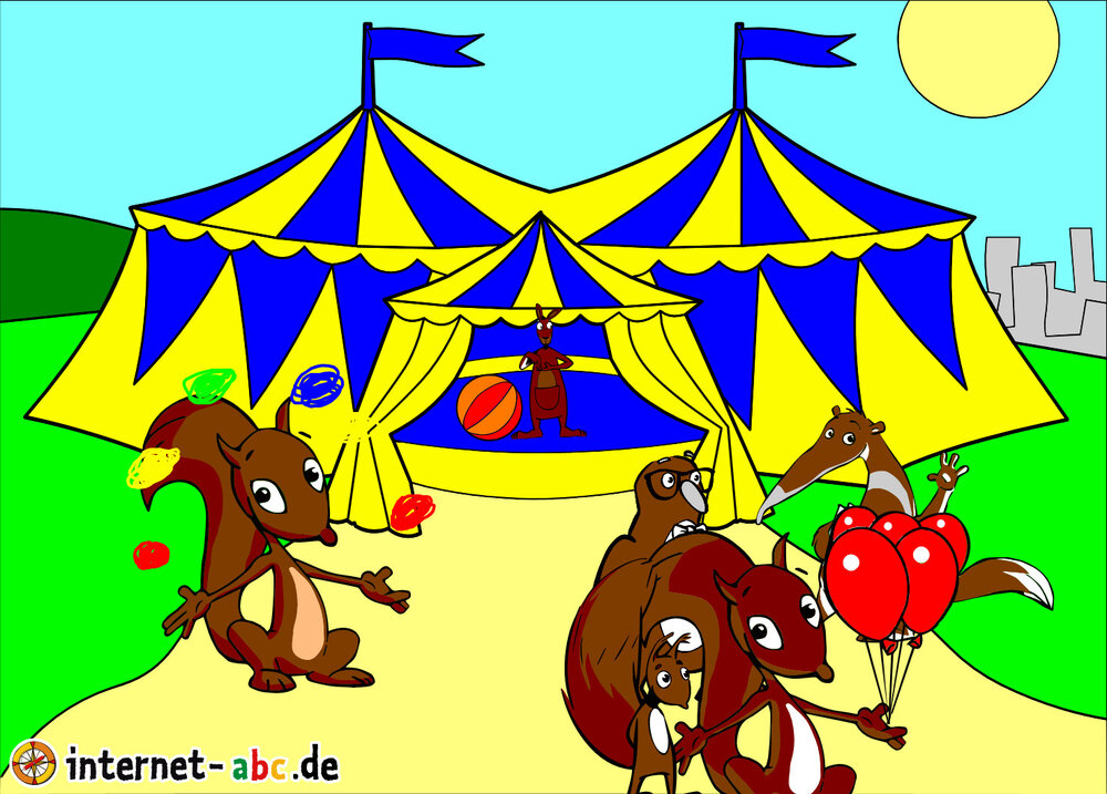 Gehst du gern in den Zirkus? Dann male doch ein schönes Bild mit den Internet-ABC-Tieren. Und erzähle dann eine kleine Geschichte dazu, okay?