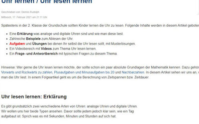 Kannst du schon die Uhr lesen? Um genau das zu erlernen oder zu üben, kannst du diese Seite besuchen. Du kannst dir analoge Uhren mit Zeigern und digitale Uhren mit Zahlen ansehen. Teste dein Wissen in den Übungen.
