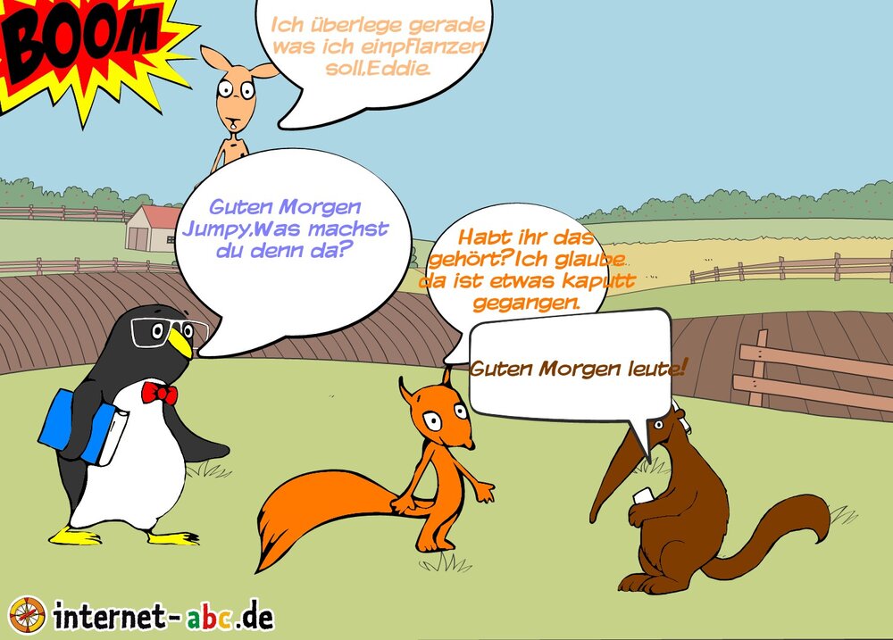 Eines Morgens wurden Eddie und seine Freunde mit einem lautem Geräusch wach.Sie rannten schnell nach draußen und fragten sich was da wohl passiert ist.Flizzie sagte:"Habt ihr das gehört leute?Ich glaube da ist etwas kaputt gegangen."Eddie und die anderen wollten unbedingt wissen was passiert ist.Sie schauten sich um,und dann entdeckten sie das der Hühnerstall zusammen gestürtzt ist.Aber zum Glück waren die Hühner niht verletzt denn sie sind rehtzeitig rausgerannt.Jumpy sagte zu den anderen:"Wir sollten den Hühnerstall reparieren."Und das taten Eddie und seine Freunde auch.Aber warum der Hühnerstall kaputt gegamgen ist das bleibt noch ein Geheimniss.