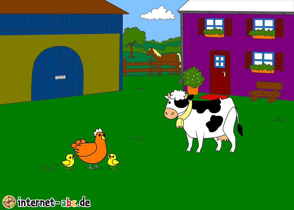 die kuh milka und das huhn fibsi und ihre küken lilia und lila lafen frei rum