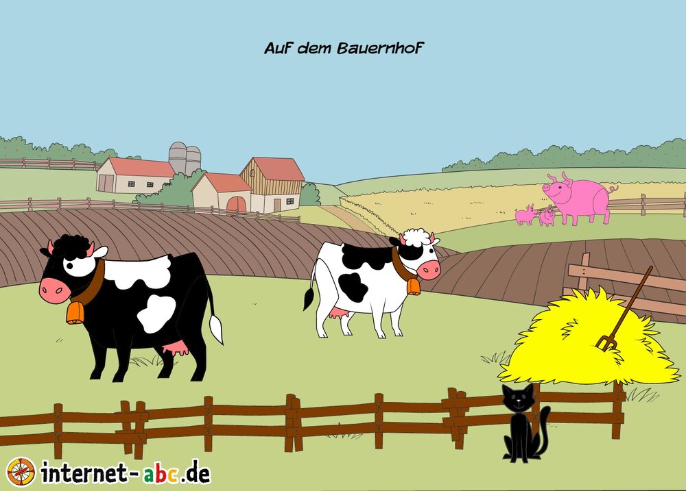 Auf dem Bauernhof gibt es viele Tiere wie Kühe, Schweine und Hühner.