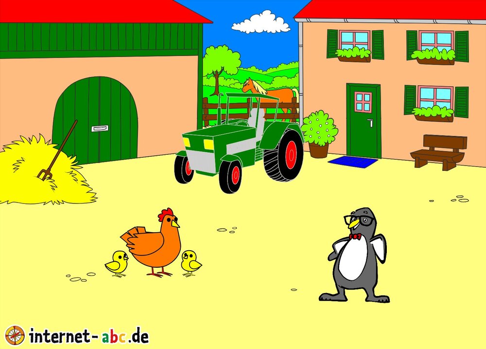 Eddi besucht in den Pfingstferien einen Bauernhof. Dort gibt es viele Tiere. Der Pinguin darf sogar Trecker fahren. Wie ungewöhnlich!