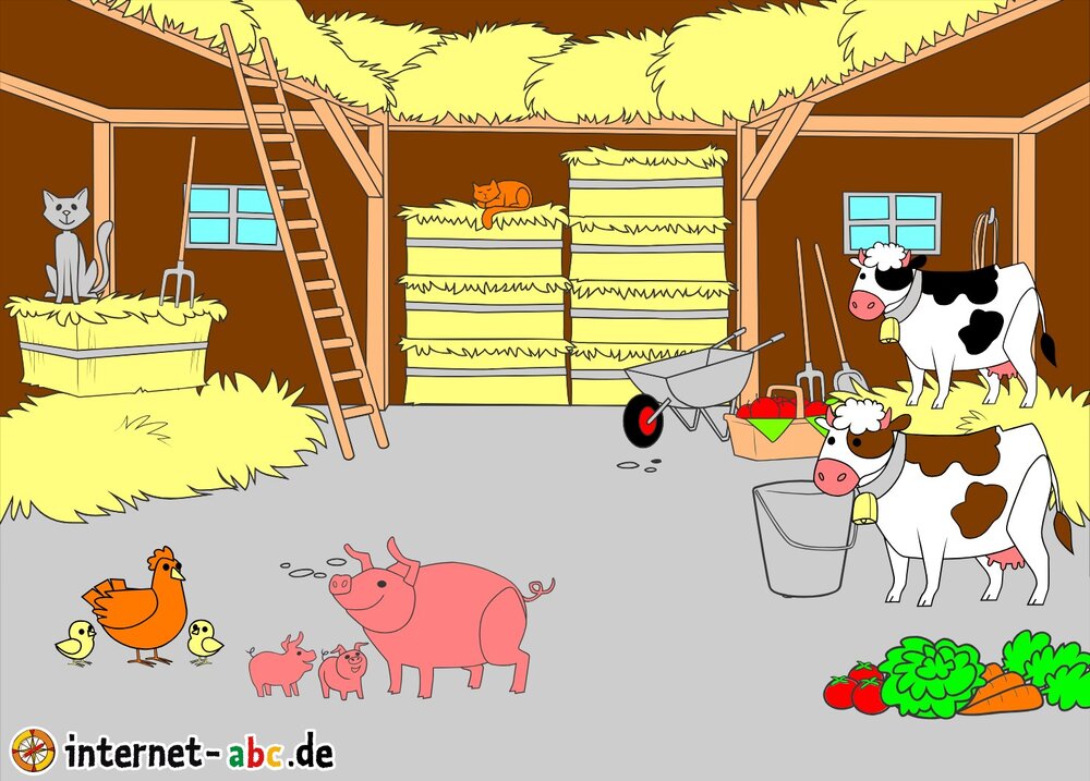 Es sind so viele Tiere hier in der Scheune und Essensvorräte.