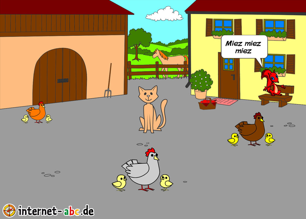 Ein schöner sonniger Tag auf dem Bauernhof. Flitzi will die Katze zu sich rufen. Hier dürfen die Hühner frei herumlaufen.
